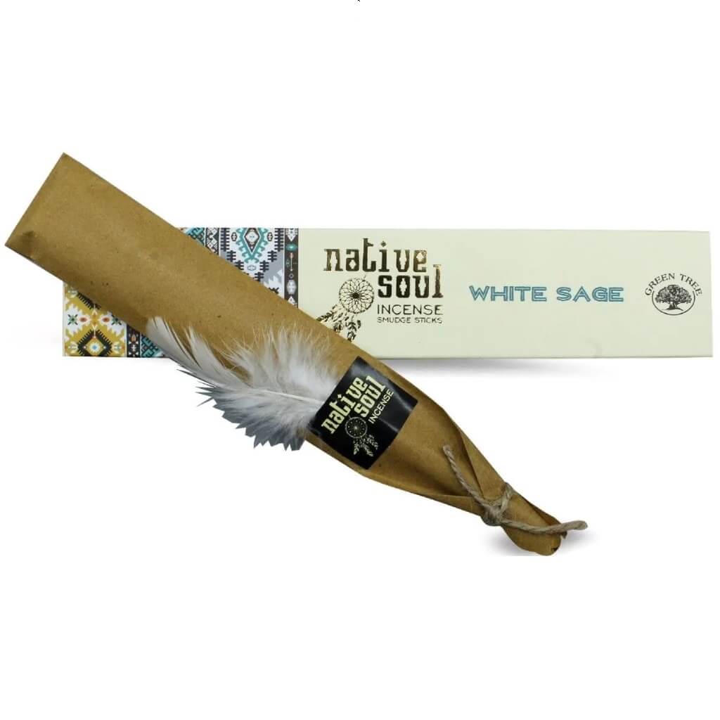 De nieuwe lijn wierook van Green Tree, Native Soul, is verpakt in een eco-vriendelijk luxe doosje met prachtige kleuren. Waar bij anderen, de wierook zelf, verpakt kan zijn in plastic, is deze wierook verpakt in een zakje van papier, dichtgebonden met een touwtje. Het doosje zelf is gevouwen als een lade, waardoor je gemakkelijk een nieuw stokje kunt pakken of een, niet geheel opgebrand stokje, kan terug plaatsen. De verrassing komt bij het openschuiven en er een smudge veertje in te vinden is.