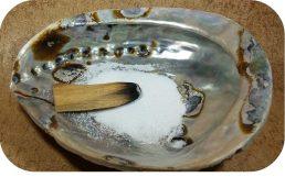 Bij bestelling van een abalone schelp ontvang je een zakje wit zand. Strooi wat van het zand in de schelp om roetvorming te voorkomen.