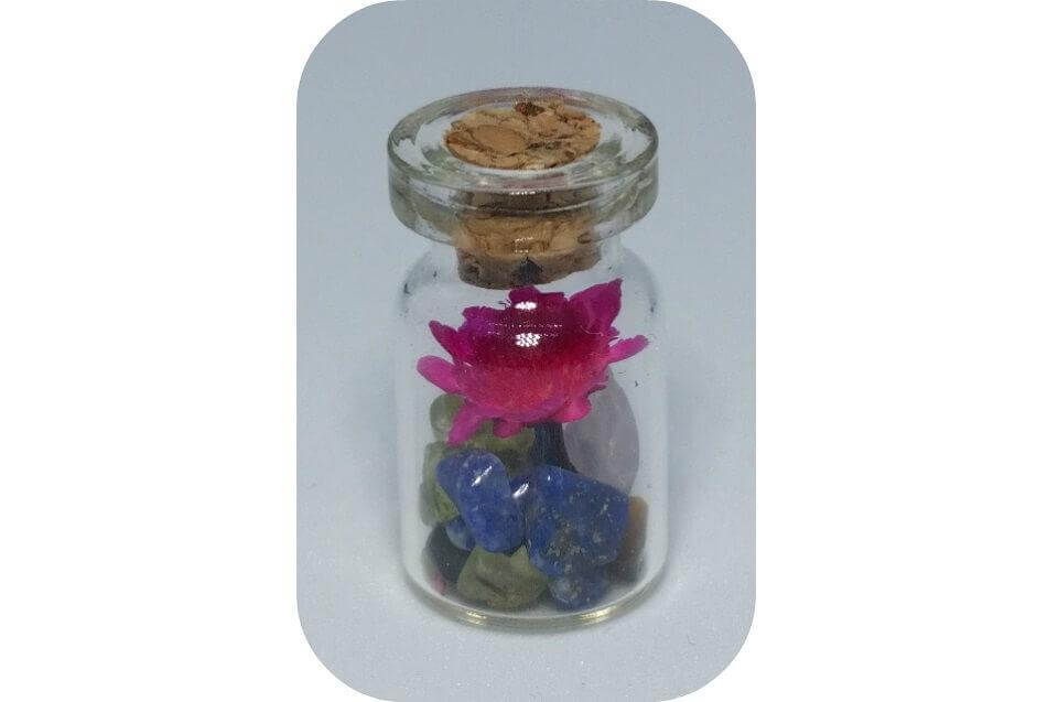 Het flesje bevat van elke chakra 1 t/m 7 een steentje welke symbool staat voor die chakra.