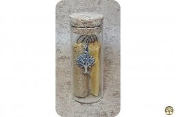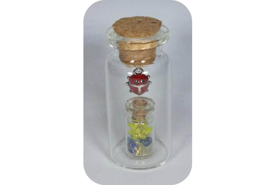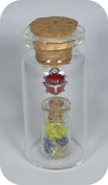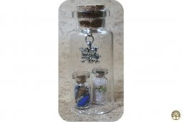 Klein flesje in een groter flesje. Het kleine flesje bevat een rozenkwarts steentje, Lapis Lazuli en wat peridoot. Een geel droog bloemetje met goudsnippers