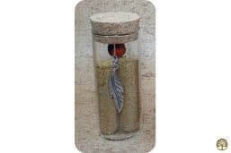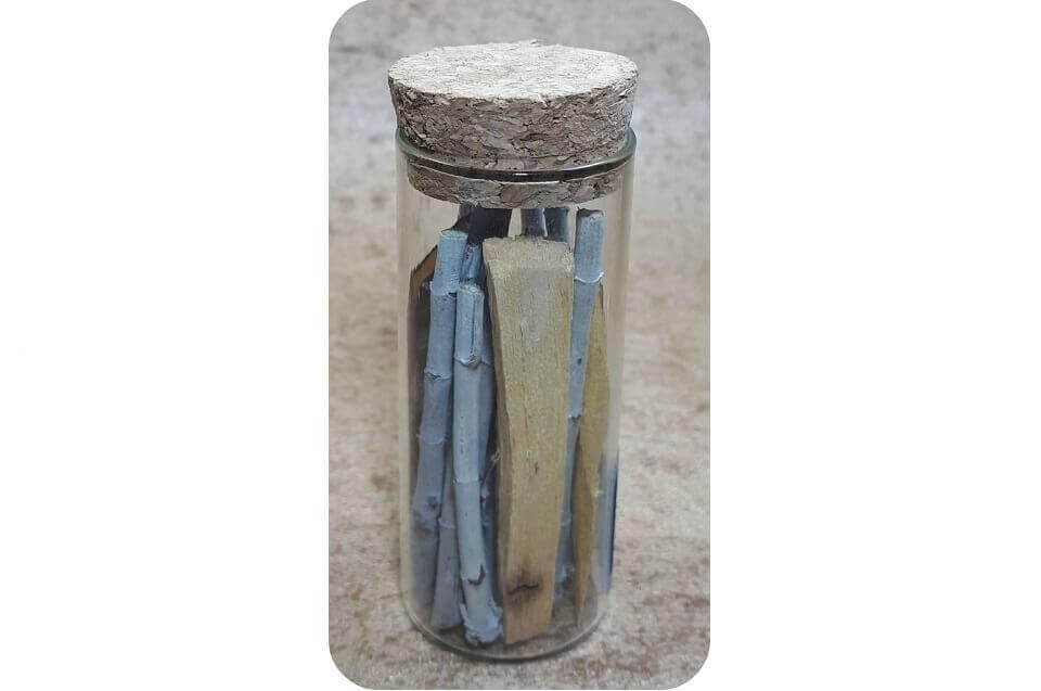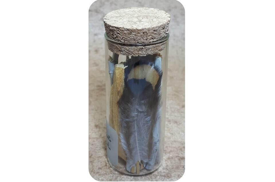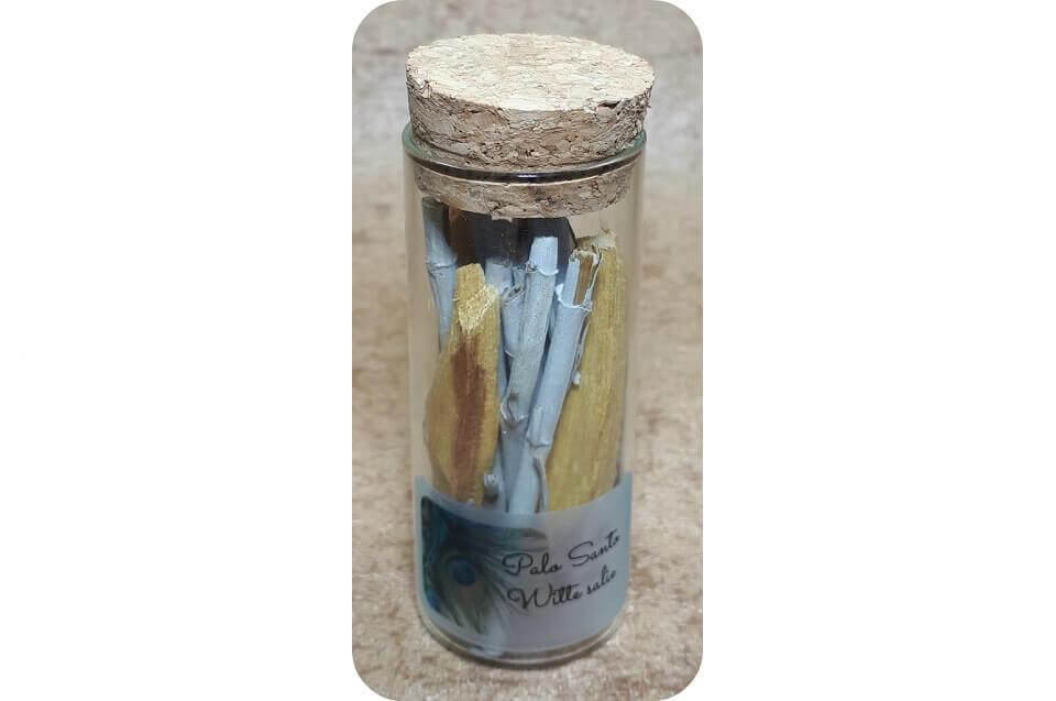 Palo Santo houtjes & Witte Salie stokjes samen met een veer in een flesje.