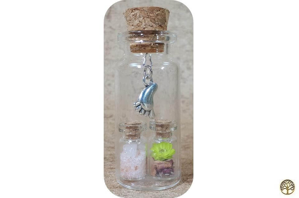 2 kleine flesjes gevuld in een groter flesje met een voet als bedel.