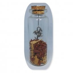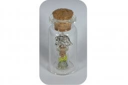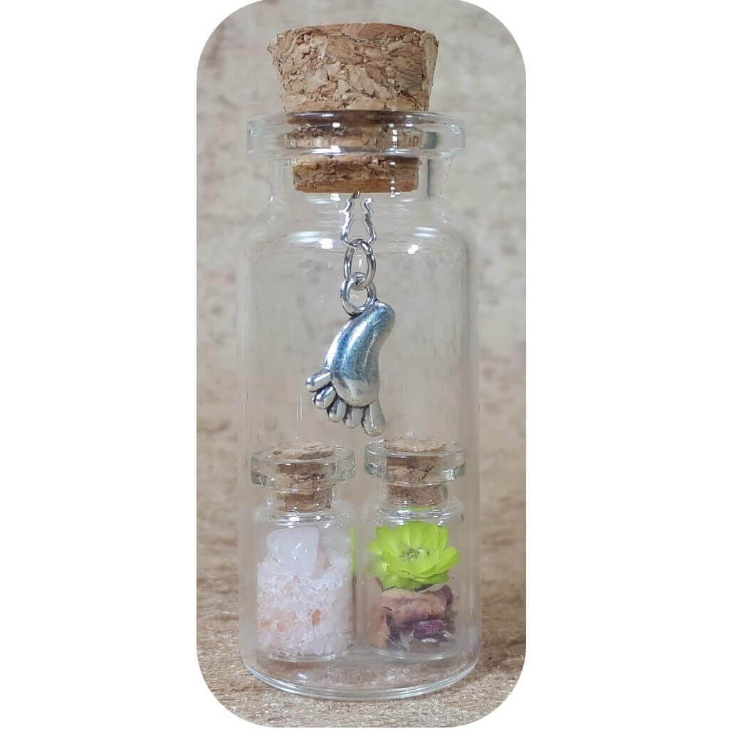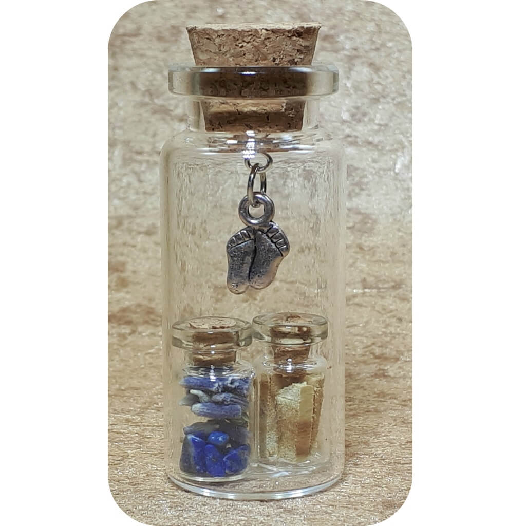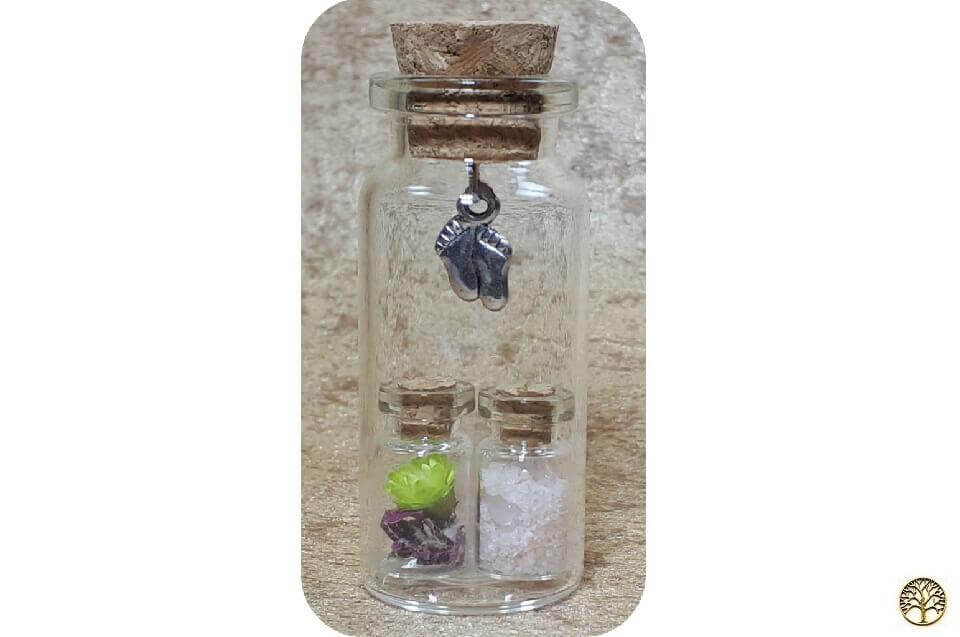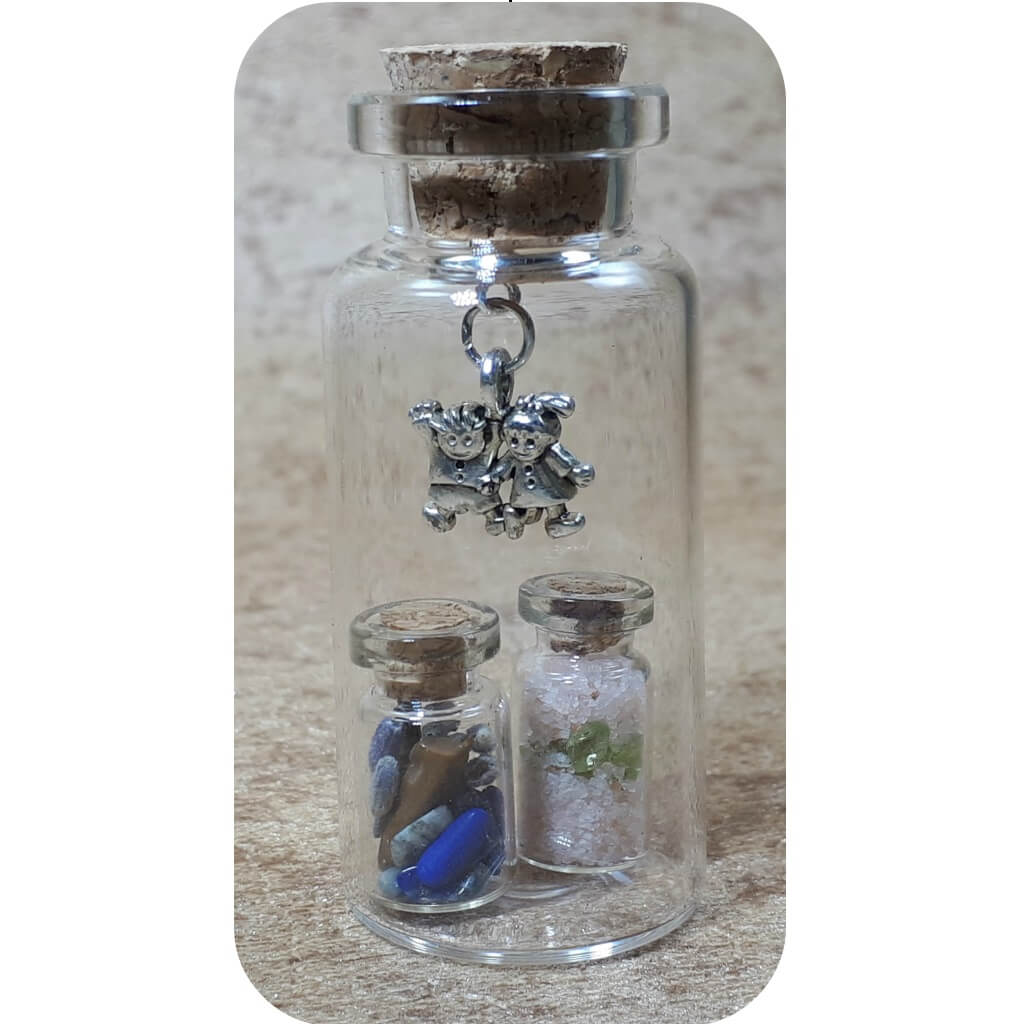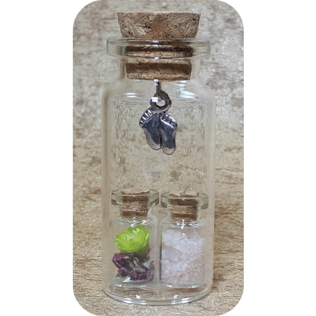 2 kleine flesjes gevuld in een groter flesje met 2 voetjes als bedel.