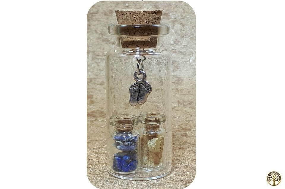 2 kleine flesjes gevuld in een groter flesje met 2 voetjes als bedel.