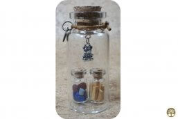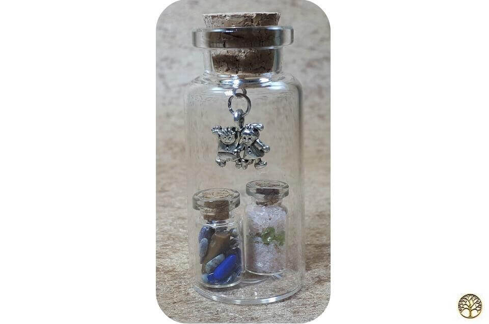 - Flesje 2 is gevuld met Himalayazout, Rozenkwarts en peridoot steentjes