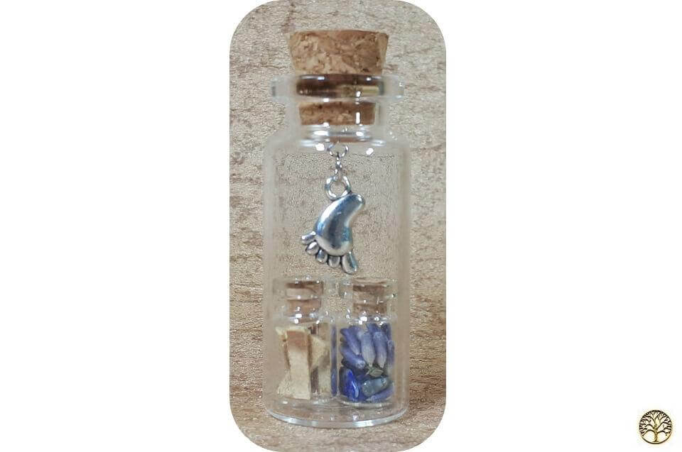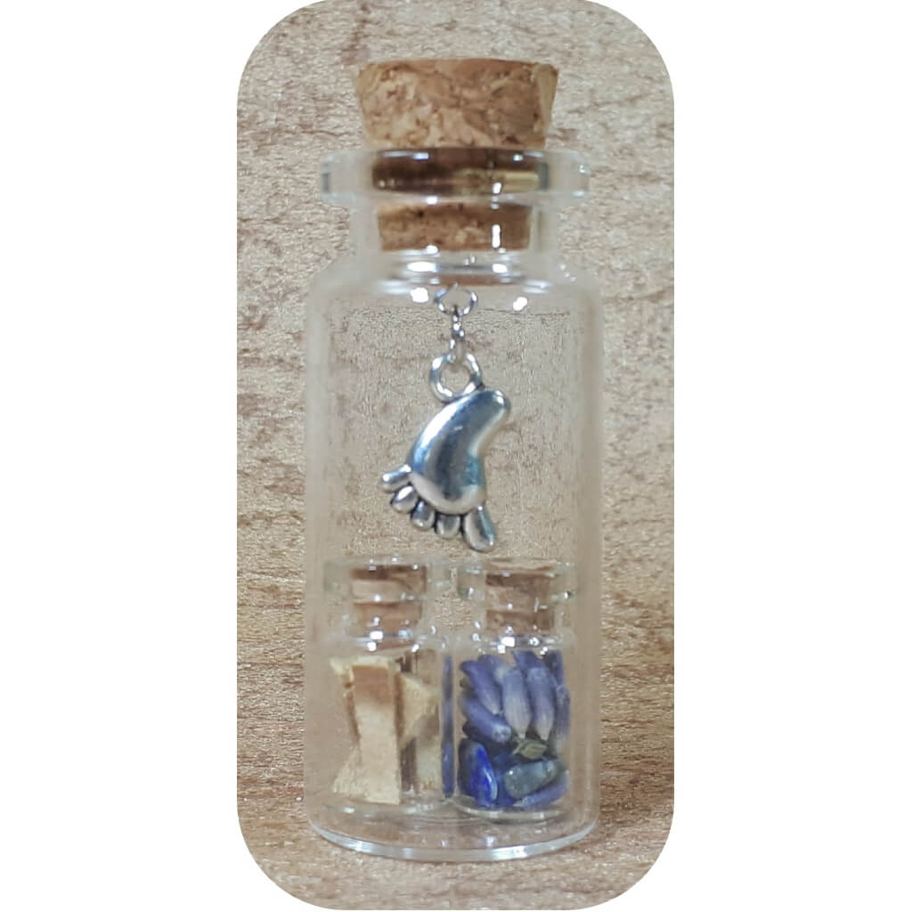 2 kleine flesjes gevuld in een groter flesje met een voet als bedel.
