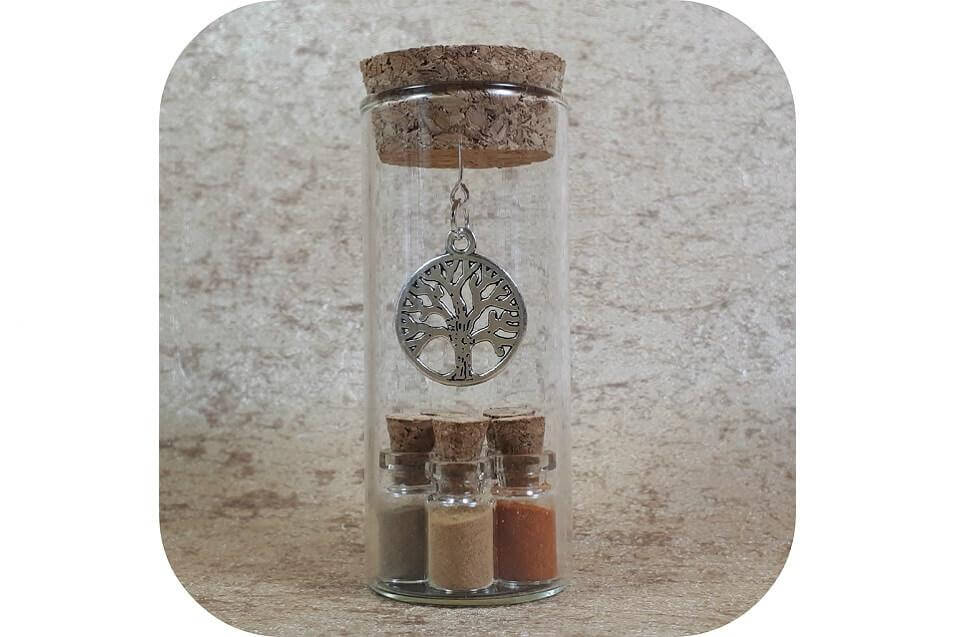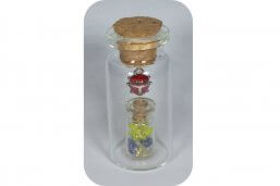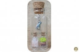1 Groot geluksflesje met een keuze uit 5 kleine flesjes, met verschillende soorten inhoud.De flesjes zijn te openen en de inhoud kun je branden en/of gebruiken. Boven de flesjes hangt een bedel naar keuze of kies voor geen 1.