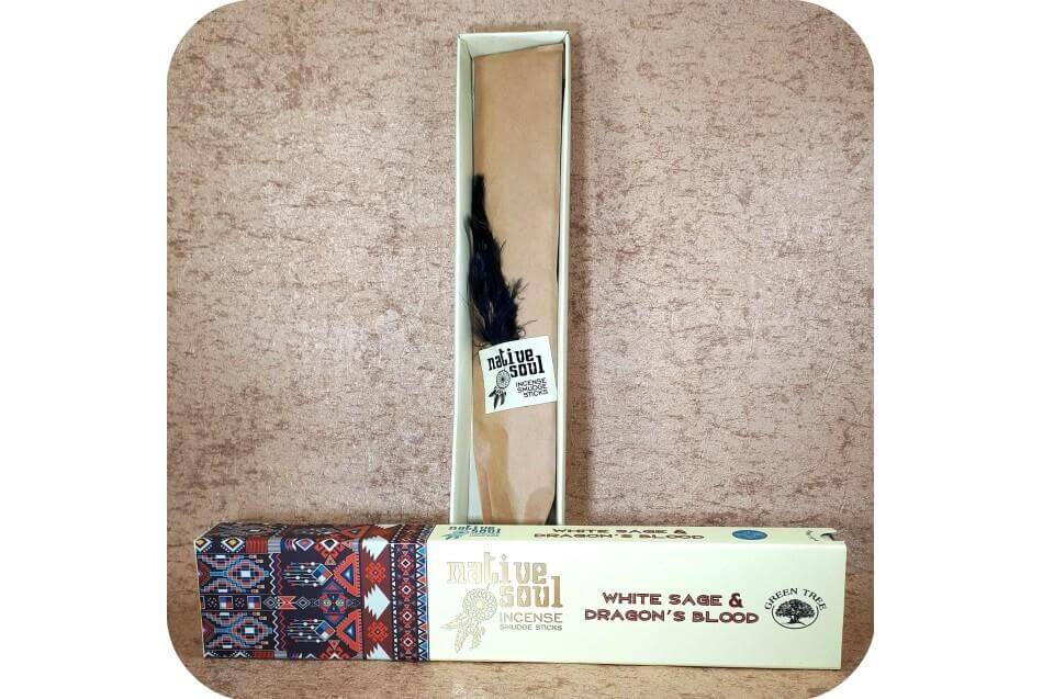De nieuwe lijn wierook van Green Tree, Native Soul, is verpakt in een eco-vriendelijk luxe doosje met prachtige kleuren. Waar bij anderen, de wierook zelf, verpakt kan zijn in plastic, is deze wierook verpakt in een zakje van papier, dichtgebonden met een touwtje. Het doosje zelf is gevouwen als een lade, waardoor je gemakkelijk een nieuw stokje kunt pakken of een, niet geheel opgebrand stokje, kan terug plaatsen. De verrassing komt bij het openschuiven en er een smudge veertje in te vinden is.