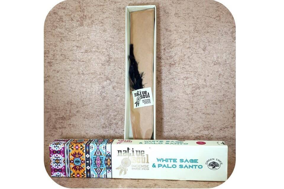 De nieuwe lijn wierook van Green Tree, Native Soul, is verpakt in een eco-vriendelijk luxe doosje met prachtige kleuren. Waar bij anderen, de wierook zelf, verpakt kan zijn in plastic, is deze wierook verpakt in een zakje van papier, dichtgebonden met een touwtje. Het doosje zelf is gevouwen als een lade, waardoor je gemakkelijk een nieuw stokje kunt pakken of een, niet geheel opgebrand stokje, kan terug plaatsen. De verrassing komt bij het openschuiven en er een smudge veertje in te vinden is.